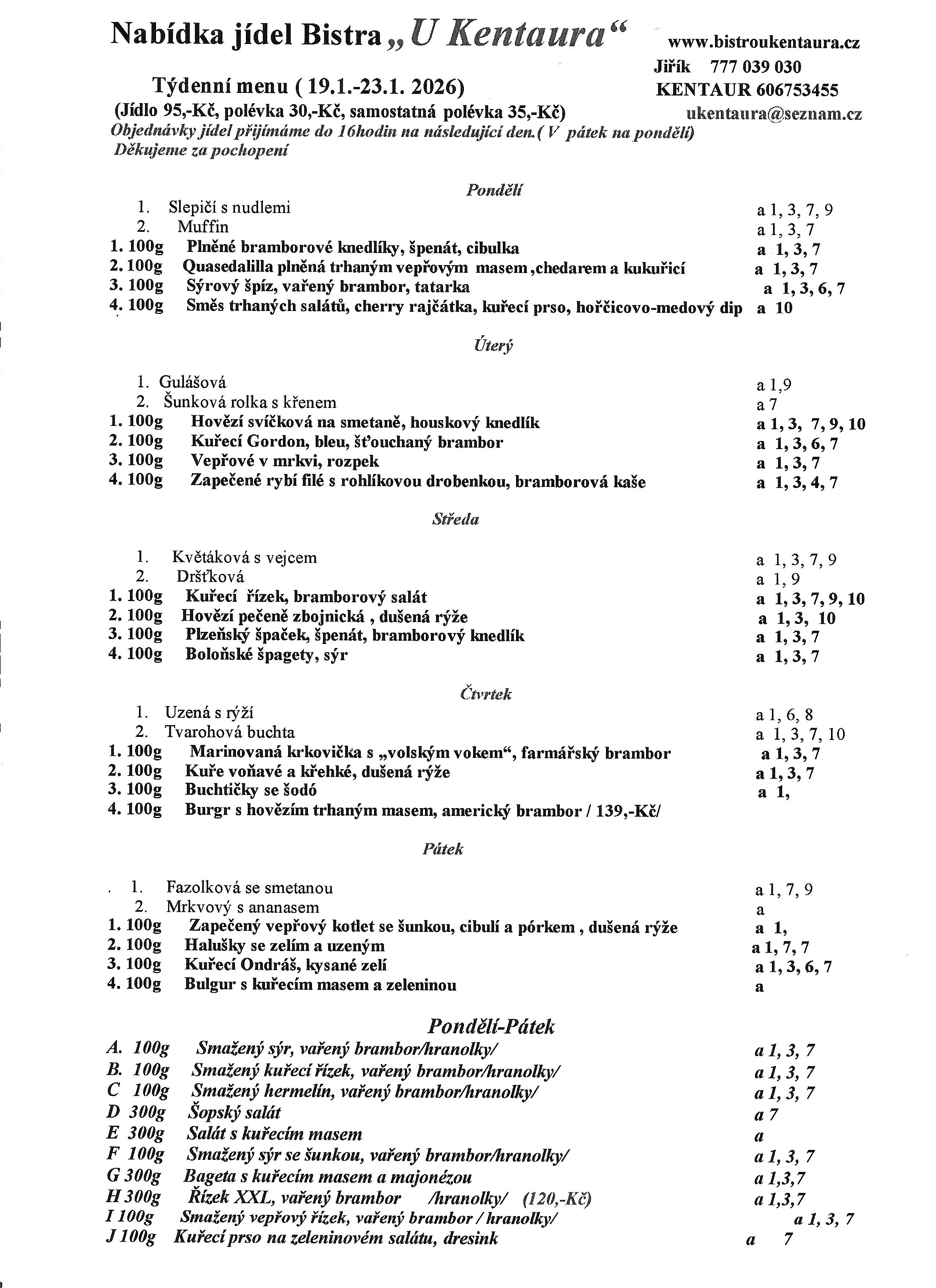 Hlavní jídlo 95,- Kč, polévka k hlavnímu jídlu 30,- Kč, samostatná polévka 35,- Kč